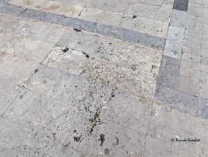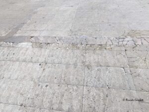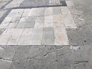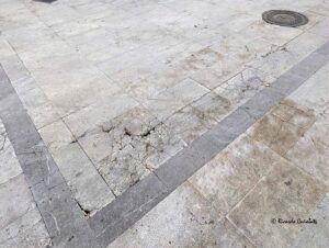 De camino, se eliminaría también la importante cantidad de piezas de solería rotas -y hasta destrozadas- hartas ya de soportar pesos para los que no están preparadas. Y no digamos de las losas que tuvieron la mala suerte de ponerse donde se agujereaba el suelo para instalar las carpas o similares y que cada vez, qué mala pata, precisaban de agujeros nuevos a escasos centímetros de los anteriores, porque no coincidían las necesidades con los de la instalación precedente. Otra cosa que prever, pues, y cada vez que se haga un agujero super imprescindible, proceder a su reparación son la solería adecuada y dejar impoluto el lugar.