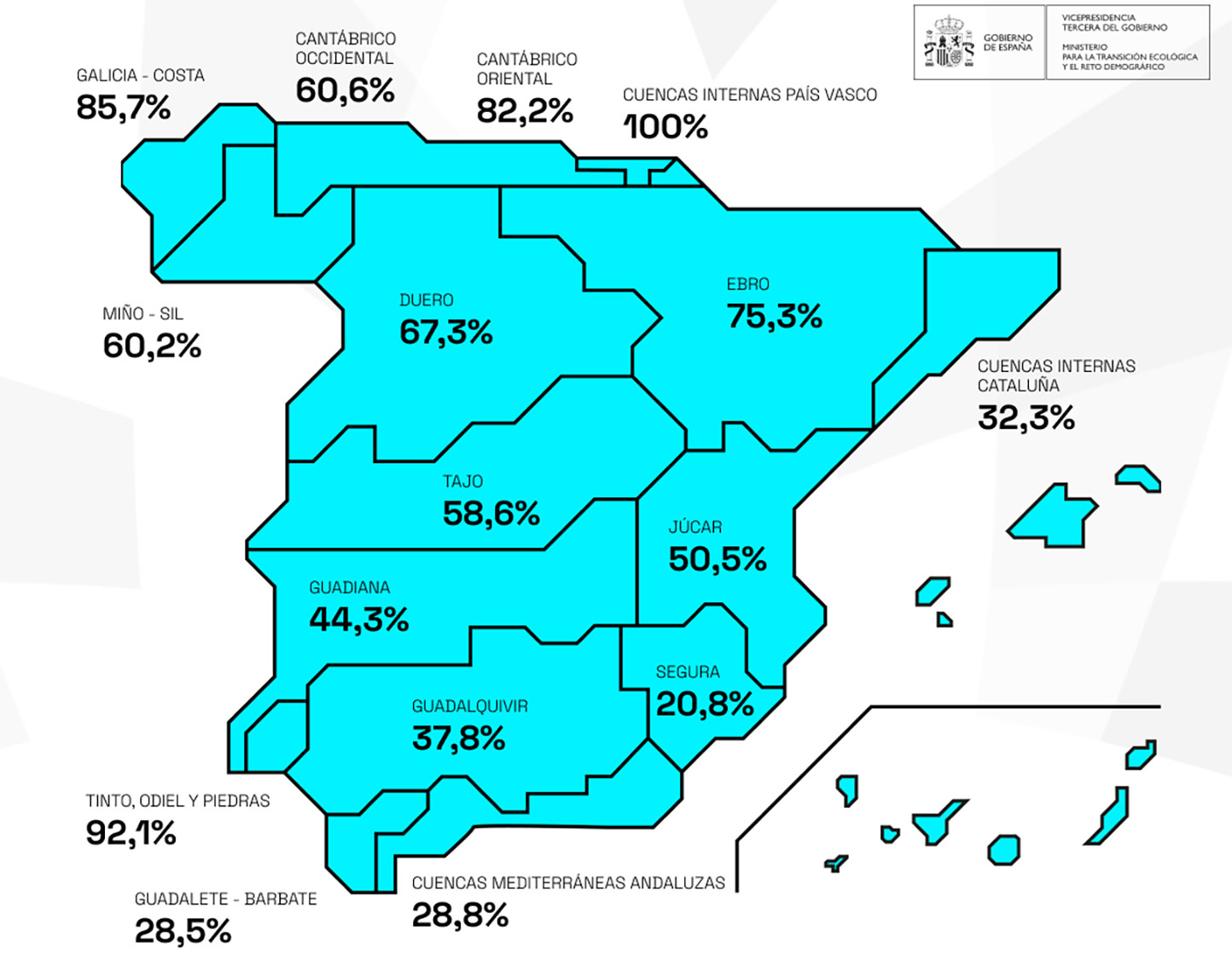 - Y, finalmente, por debajo de 30% están Cuenca Mediterránea Andaluza al 28,8%, Guadalete-Barbate al 28,5% y Segura al 20,8%.