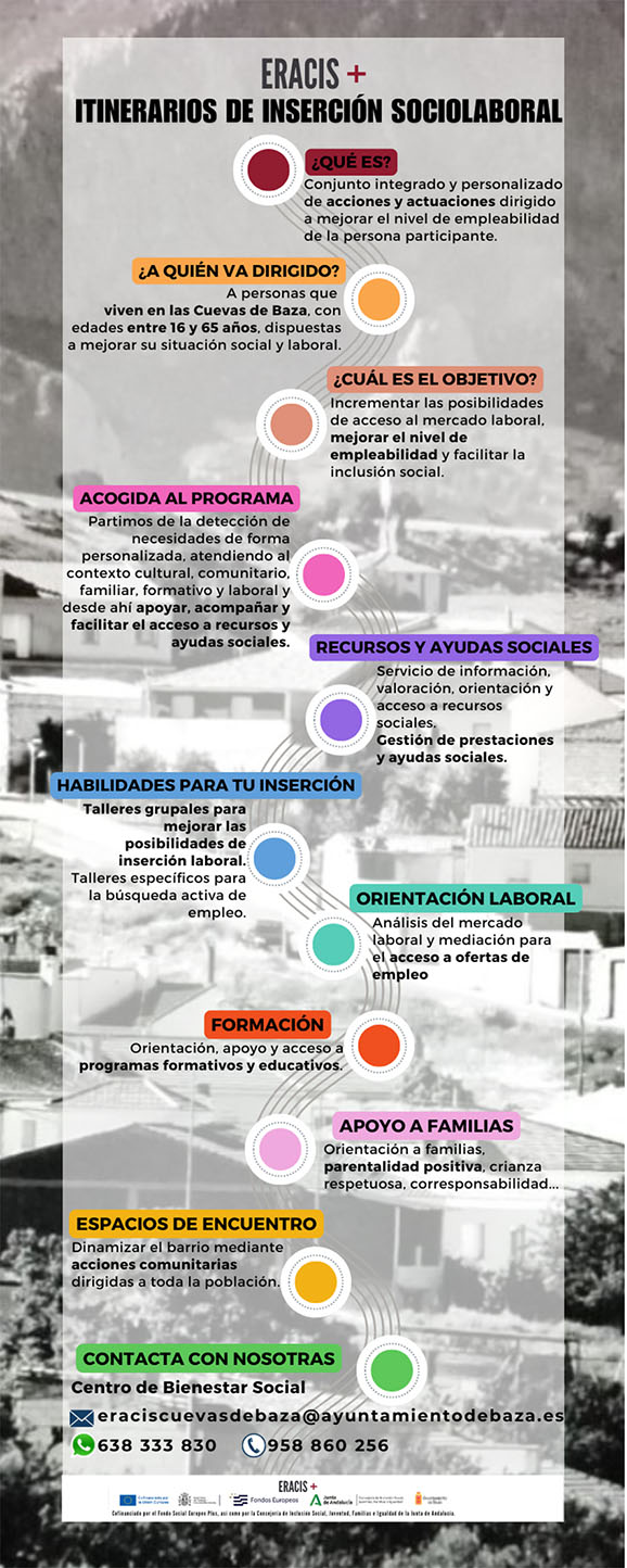 ERACIS+: Un pilar clave para la inserción laboral y la formación en las Cuevas de Baza. El programa ERACIS+, cofinanciado por el Fondo Social Europeo Plus y la Consejería de Inclusión Social, Juventud, Familias e Igualdad de la Junta de Andalucía, ha demostrado ser un recurso fundamental para fomentar la inclusión social y laboral en las Cuevas de Baza. Durante 2024, el programa benefició directamente a 80 personas y sus familias, logrando que un 25% de los participantes accedieran a formación profesional homologada, mientras otro 25% consiguió empleo en empresas locales.