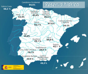 Como es habitual, hay un grupo de embalses que siguen con unas reservas por encima del 60%, entre los que están los del Cantábrico Oriental y Occidental, Galicia Costa, Cuencas internas del País Vasco, Júcar, Ebro y Tinto, Odiel y Piedras, mientras que otros ámbitos los embalses no superan el 30% de su capacidad de almacenamiento, como es el caso de las cuencas del Guadiana y Guadalquivir.