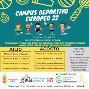 El Ayuntamiento bastetano organiza un Campus Deportivo para menores de 4 a 12 años en el Polideportivo Municipal de Baza. El Ayuntamiento de Baza ha puesto en marcha una nueva iniciativa deportiva para este verano: el Campus Deportivo Europeo, que nace con la finalidad de ofrecer a los más jóvenes una alternativa divertida y saludable para los meses de verano.