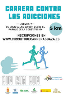 Llega a Baza la primera carrera del verano: la Carrera Nocturna Contra las Adicciones. Ya se encuentran abiertas las inscripciones para la primera carrera del verano, algo que supone la vuelta de la Carrera Nocturna Contra las Adicciones, fijada para el próximo 7 de julio a las 22 horas, la cual cumple este año su segunda edición, con salida y llegada desde el Parque de la Constitución.
