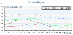 Por último, ofrecemos la misma referencia referida al Embalse del Negratín, que cuenta con una capacidad de 567 hm3, pero solo contiene 179 hm3 de agua, equivalentes a un 31.57% del total y tras haber disminuido ese almacenamiento en 5 hm3 durante la última semana. Su comparación con la serie histórica nos dice que en el 2021 se almacenaban 215 hm3 y en la media de la misma semana de los diez últimos años, su contenido era de 328 hm3, equivalentes a un 57.87% de su capacidad total.