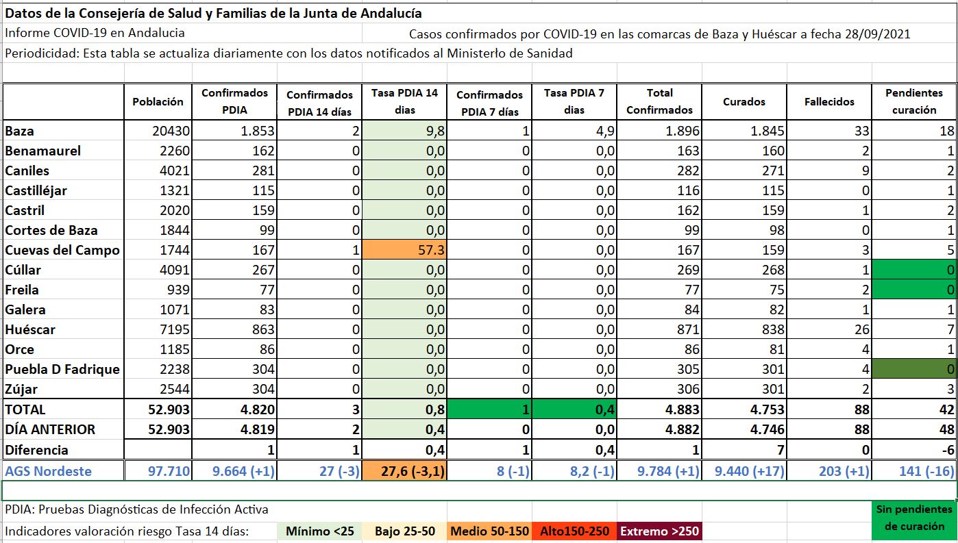 Junto a ese dato, el resto de estadísticas no sufrían alteración alguna en las comarcas de Baza y Huéscar, con la única excepción de añadir 7 curados más, de los que 5  pertenecen a Baza, 1 a Cuevas del Campo y otro a Zújar, todo lo cual hace que sean ya 42 personas de estas dos comarcas las que están pendientes de curación, de las que 18 son de Baza, 7 de Huéscar, 5 de Cuevas del Campo y el resto de municipios que tienen entre 1 y 3, excepto las localidades que ya no tienen pacientes en esa situación, que son Cúllar, Freila y La Puebla de don Fadrique.