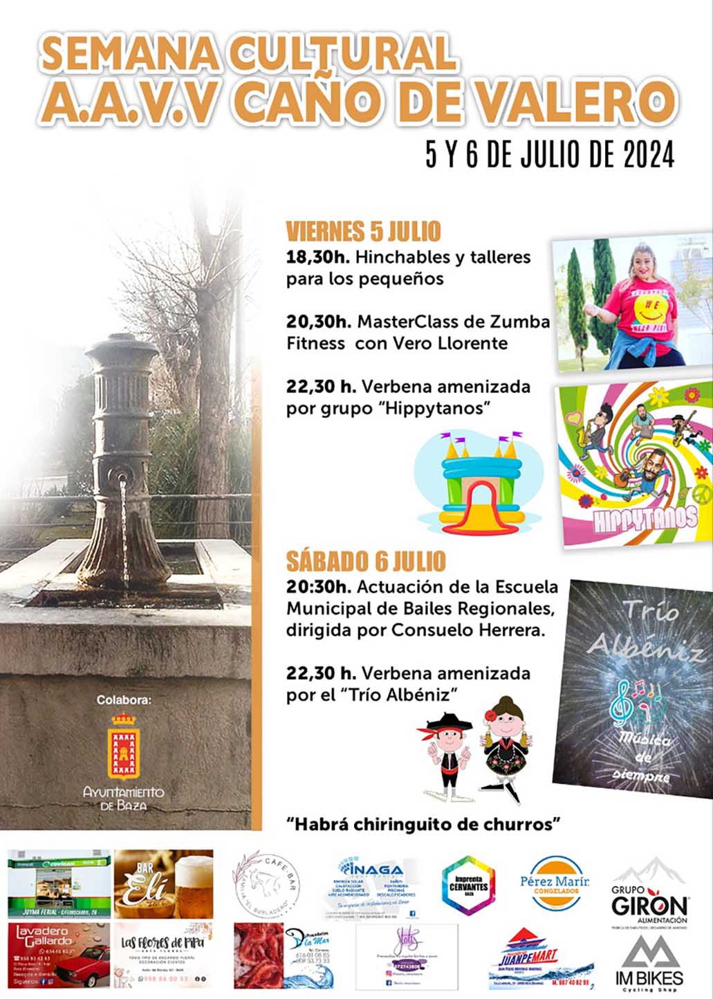 El Caño de Valero celebra sus fiestas este fin de semana, 5 y 6 de julio. La Asociación de Vecinos del Caño Valero celebra, en el primer fin de semana de julio, sus ya tradicionales fiestas populares, para las que renueva la invitación de años anteriores e invita a todos los bastetanos a que se acerquen y disfruten de ellas, os días 5 y 6 de julio, compartiendo las actividades programadas con sus vecinos, así como algunas instalaciones para el disfrute de los más pequeños y sin que falte el chiringuito donde saborear los mejores churros.