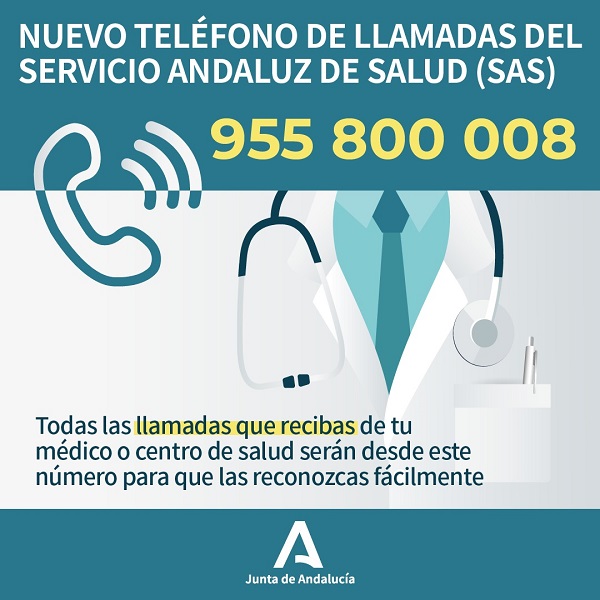 Para tratar de mejorar situaciones que impedían la comunicación con los pacientes, el Servicio Andaluz de Salud (SAS) ha puesto en marcha un número único para las llamadas salientes desde cualquier centro sanitario de la comunidad autónoma con el fin de facilitar el reconocimiento por parte de la ciudadanía. Se trata del 955 800 008, con prefijo sevillano, con lo que dejarán progresivamente de aparecer números largos de centralita o números ocultos cuando se reciba una llamada desde el SAS.