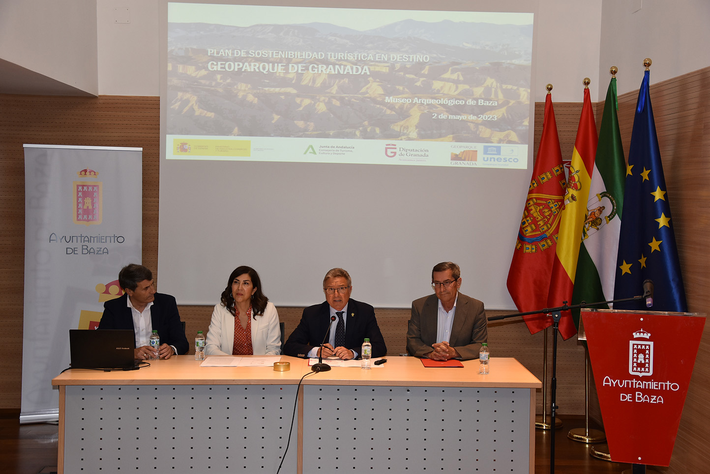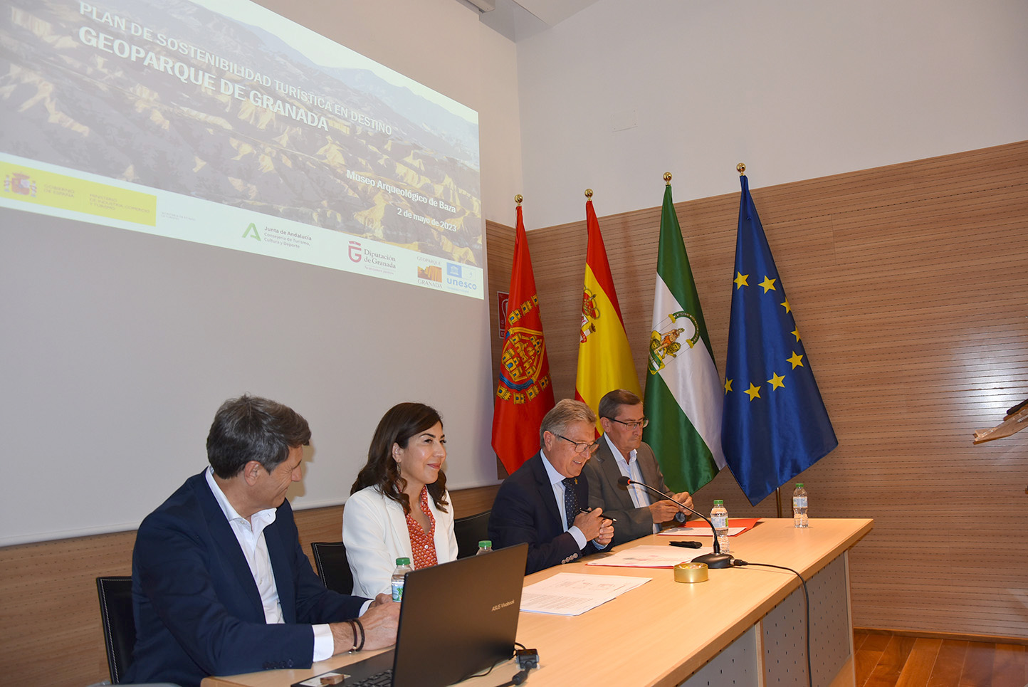 Mas tarde, comparecieron en el Museo Arqueológico de Baza, junto al alcalde, Manuel Gavilán. Allí, el presidente, que informó que el Geoparque ya ha elevado el turismo de la zona un 30%, explicando que desde 2021 se están implementando diversas actuaciones recogidas en el Plan, que se desarrollará hasta 2024. Es el caso, por ejemplo, del trabajo que se viene realizando con empresarios turísticos del territorio para definir el Sistema de Sostenibilidad Turística del Geoparque. Para ello, se ha realizado un proceso de acreditación, en colaboración con la Asociación de Ecoturismo de España, que conlleva acciones de formación y acompañamiento de los empresarios, facultándoles para ser miembros del Club de Ecoturismo de España y empresas colaboradoras del Geoparque.