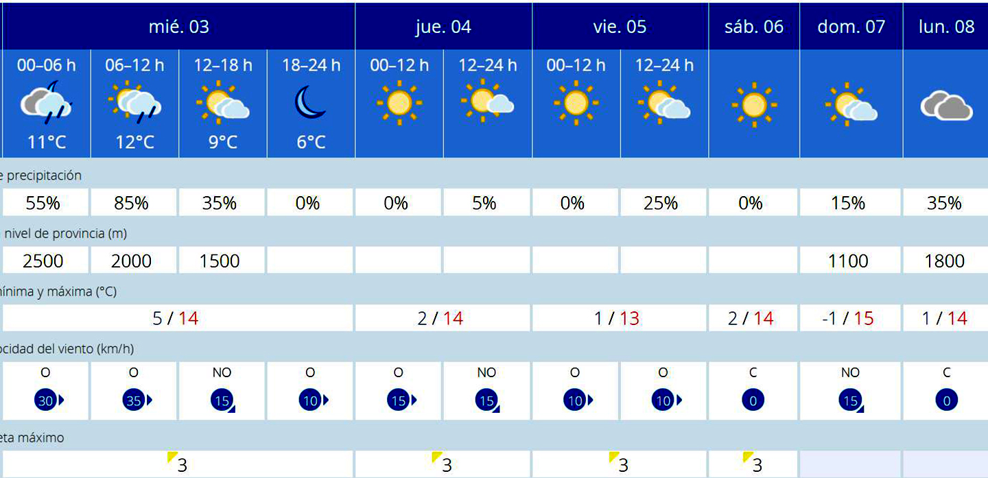 La “aclimatación” a la que nos referimos para hoy estará entre los 5 y los 15ºC, tras lo que el resto de días, hasta la fecha indicada, las mínimas estarán entre el -1 y los 2ºC y las máximas entre los 13 y los 15ºC, valores que se repetirán también en los próximos días.