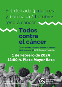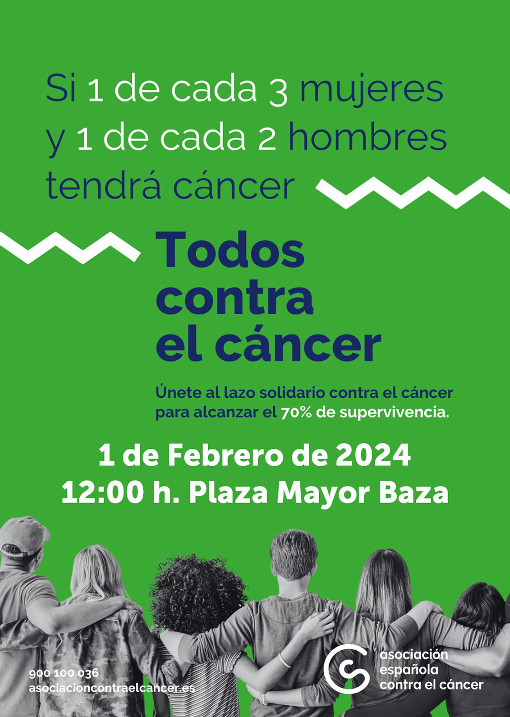 En el caso de Baza, será la Junta Local de la Asociación Española contra el Cáncer la encargada de que esta conmemoración no pase de largo por nuestra ciudad. Para ello ha convocado un acto que tendrá lugar mañana, 1 de febrero, a las doce del mediodía y en la Plaza Mayor, bajo el eslogan de “Todos contra el cáncer”, con el que se hace un llamamiento a la población de Baza y nuestra comarca para no bajar la guardia ante esta enfermedad y ofrecer su colaboración a esta asociación en la lucha que llevan a cabo.