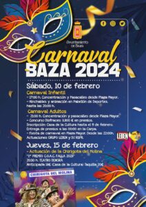 El Carnaval de Baza 2024 llega con diversión y actividades para todos el sábado 10 de febrero y la actuación de una chirigota profesional el jueves 15. Baza se prepara para celebrar su Carnaval 2024, una fiesta que contará con dos días de actividades para todos los públicos que ayer se presentaba, ante los medios locales, por el concejal de Cultura, José Gabriel López.