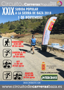Mañana jueves se celebra la XXIX Subida Popular a la Sierra de Baza. El jueves día 1 de noviembre en Baza hay un cita pendiente con nuestra Sierra, gracias a una nueva edición, la XXIX, de la Subida Popular a la Sierra, una prueba en la que se puede participar andando, en bici, corriendo o de ambas maneras  y para la que el plazo de inscripción termina esta misma tarde, a las 19 horas., en el Pabellón Municipal de Deportes y en la web circuitodecarrerasbaza.es, al precio de cinco euros.
