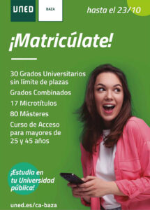 La UNED de Baza recuerda que el periodo de matrícula está ya en la recta final e invita a no perder la oportunidad de comenzar o continuar estudios universitarios en nuestra ciudad. Compaginar la vida de cada cual con sus metas para llegar tan lejos como uno se proponga, se hace posible gracias a la Educación Superior de calidad que nos ofrece la UNED, donde además se permite cursar los estudios elegidos al ritmo que cada persona precise, pues la matrícula se puede realizar de asignaturas sueltas y no asumir la responsabilidad de sobrecargas que luego no puedan ser atendidas.