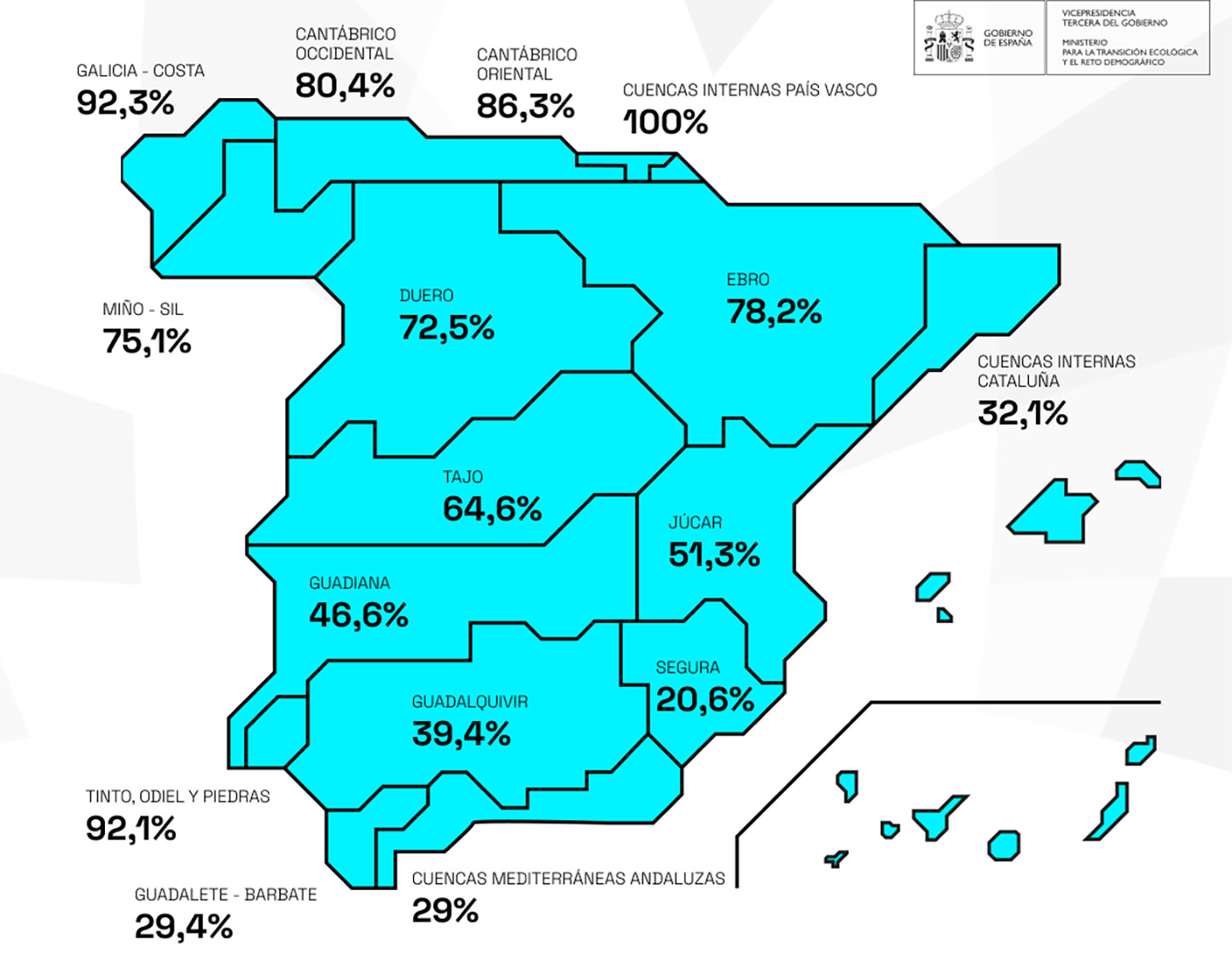Y, finalmente, por debajo de 30% están Guadalete-Barbate al 29,4%, Cuenca Mediterránea Andaluza al 29% y Segura al 20,6%.