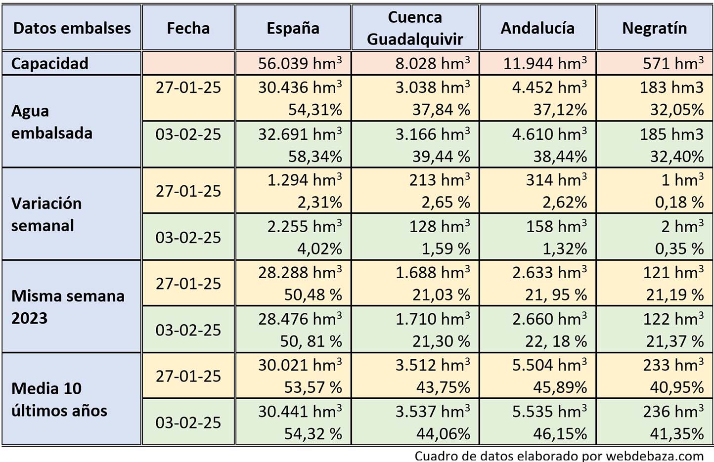 La reserva hídrica recibe en la última semana un notable incremento de agua embalsada en España, la Cuenca del Guadalquivir y Andalucía, pero no llega al embalse del Negratín. Ayer se daban a conocer los datos registrados el pasado lunes, según los cuales la reserva hídrica española está al 54,3% de su capacidad total, mientras que los embalses almacenan actualmente 30.436 hm³ de agua, aumentando en la última semana en 1.294 hm³ que suponen el 2,31% de la capacidad total actual de los embalses españoles, a lo que se añade que son ya ocho las cuencas que superan el 70%