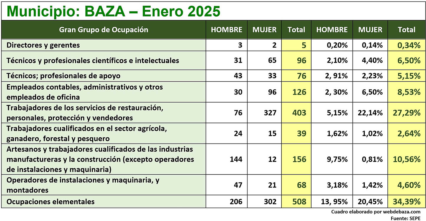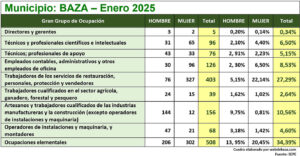 Cifras que, en Baza, indican la mejora del empleo masculino, disminuyendo en 8 hombres la cifra de desempleados, mientras que empeoraron las cifras para las mujeres, con 27 de ellas que hicieron crecer la cifra de paradas. Sin embargo, las cifras indican una mejora en la tasa interanual, pues en enero de 2024 eran 1.591 las personas en busca de empleo (640 y 951).