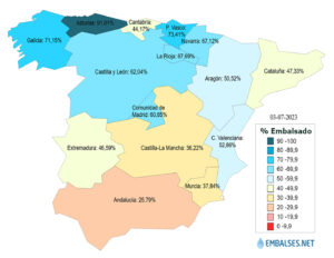 Las cuencas que se encuentran con un almacenamiento superior al 60% son: Cantábrico Oriental se encuentra al 90,4%, Cantábrico Occidental al 90,4%, Cuencas internas del País Vasco al 76,2% , Galicia Costa al 74,7%, Miño-Sil al 70,3% , Tinto, Odiel y Piedras al 69,4% y Duero al 61,4%.