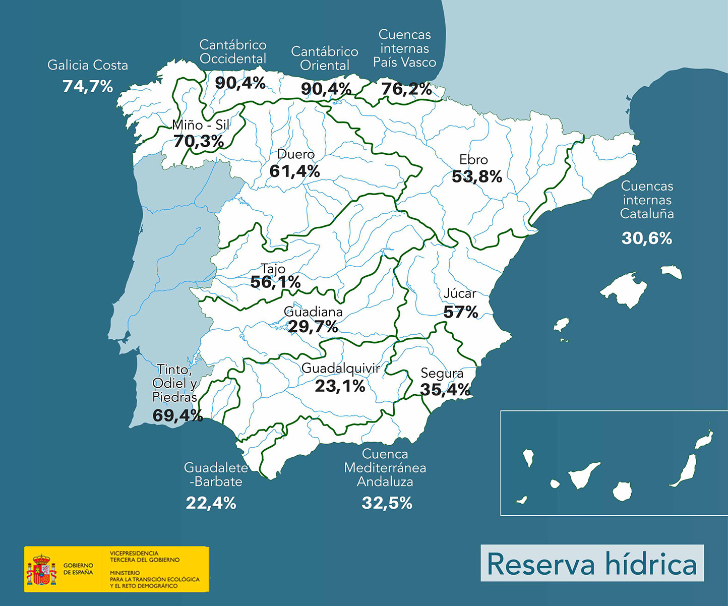Entre el 60% y el 30%, las cuencas del Tajo al 56,1%, Ebro al 53,8%, Júcar al 57%, Segura al 35,4%, Cuenca Mediterránea Andaluza al 32,5% y Cuencas internas de Cataluña al 30,6%