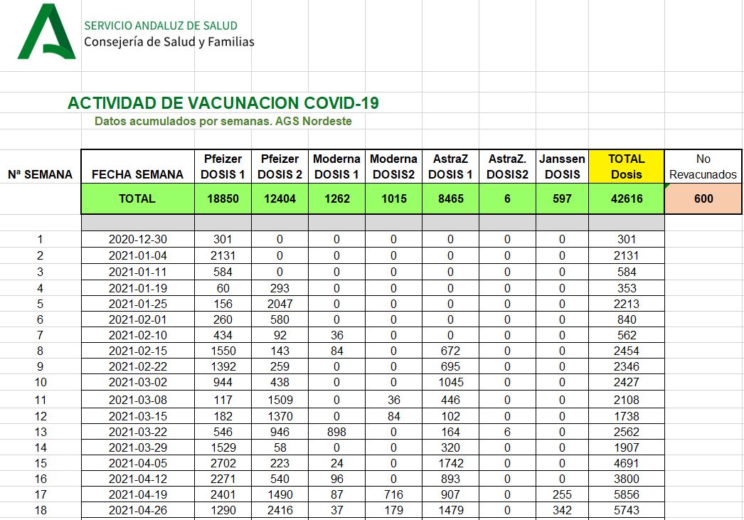 El AGS Nordeste de Granada supera con creces las 5.000 vacunas en las últimas semanas. Informaciones procedentes del AGS Nordeste de Granada indican que hasta la semana del 26 de abril pasado, se han puesto 42.616 dosis de la vacuna de la Covid-19, en el territorio de su ámbito.