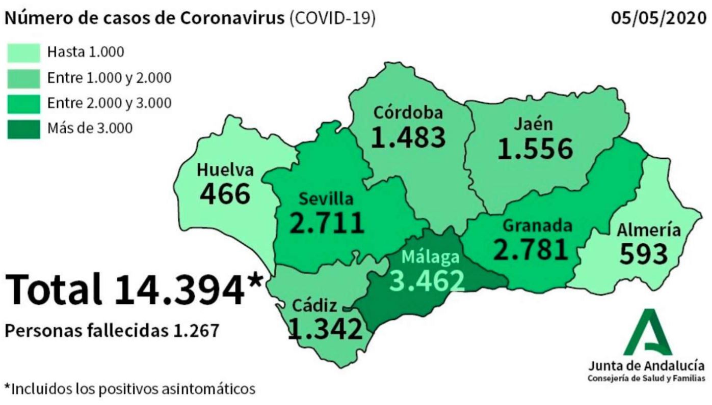 La Consejería Salud y Familias informa del aumento de 45 nuevos casos de Coronavirus en las últimas horas. La Consejería Salud y Familias informa, con fecha 5 de mayo, de que se han confirmado en Andalucía 45 nuevos casos de Coronavirus en las últimas horas, por lo que el número total de afectados en asciende a 14.394 personas en nuestra Comunidad.