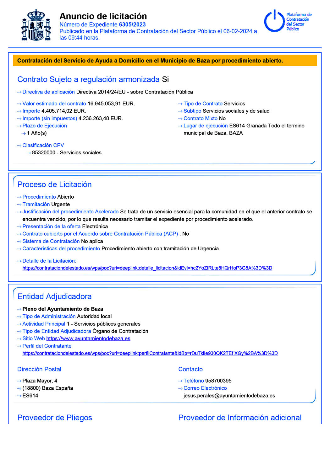 Publicado el anuncio de licitación que rige la Contratación del Servicio de Ayuda a Domicilio en el municipio de Baza. Ya ha sido publicado, en la Plataforma de Contratación del Sector Público, el anuncio que rige la Contratación del Servicio de Ayuda a Domicilio en el municipio de Baza. El presupuesto base de licitación es de 4.405.714,02 euros, IVA incluido, y el periodo de duración del contrato es de un año, pudiendo ser prorrogado anualmente por tres años más.