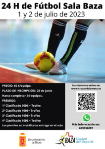 Abierto hasta el 28 de junio el plazo para inscribirse en las 24 horas de Fútbol Sala Baza. Unas 24 horas que vuelven al calendario deportivo veraniego de nuestra ciudad y que se disputarán durante los días 1 y el 2 de julio, con un precio de inscripción por equipo que es de 60 euros.