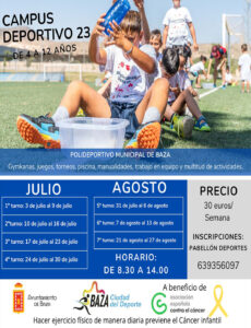 Abierto el plazo de inscripción para el Campus Deportivo para menores de 4 a 12 años de este verano. El Ayuntamiento de Baza pone en marcha, también este verano, un Campus Deportivo dirigido a menores de 4 a 12 años y que se plantea con la finalidad de ofrecer a los más jóvenes una alternativa divertida y saludable para los meses de verano.
