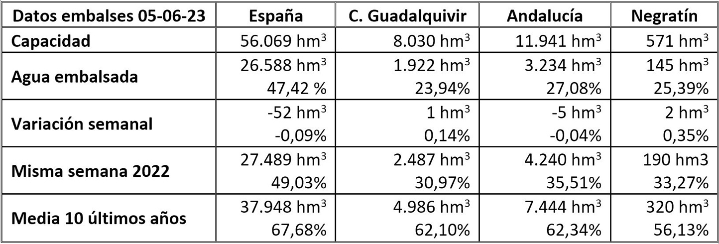 Para empezar, a nivel nacional la reserva hídrica española está al 47,4 por ciento de su capacidad total. Los embalses almacenan actualmente 26.588 hm³ de agua, con lo que disminuye en la última semana en 52 hectómetros cúbicos, que suponen el 0,1 por ciento de la capacidad total actual de los embalses, situación que no refleja una mejora suficiente para siquiera igualar el almacenamiento de la semana anterior.