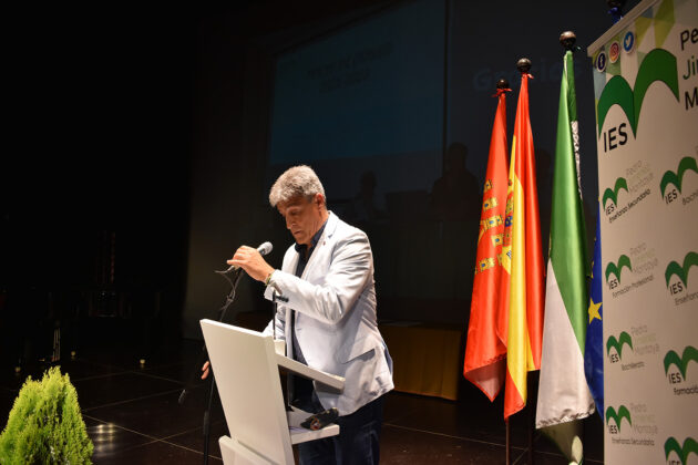Después de una espectacular introducción y entrada del alumnado al patio de butacas dio comienzo el acto con unas palabras del jefe de estudios, Manuel Navarro, hacia el director del Centro que terminaba su mandato en este curso y su pronta jubilación. Fueron palabras llenas de emotividad y agradecimiento que emocionaron a los asistentes y especialmente al homenajeado. Lo mismo ocurrió a continuación con la intervención de la delegada María José Martín, que también quiso estar presente en la despedida y agradeció enormemente la labor del mencionado director.