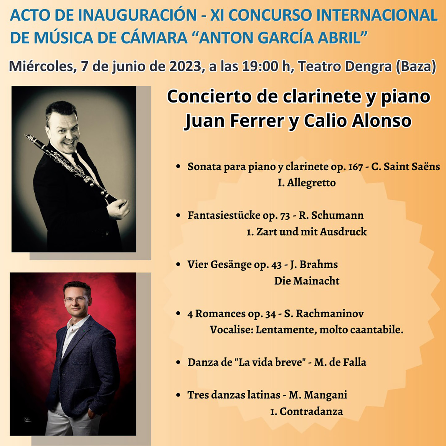 Todo listo para la inauguración del XI Concurso Internacional de Música de Cámara Antón García Abril que esta tarde celebra su sesión inaugural en el Teatro Dengra. Acto inaugural que tendrá lugar en la tarde de hoy miércoles 7 de junio, a las 19 horas, en el escenario del Teatro Dengra y en el que se incluye un concierto del clarinetista Juan Ferrer y el pianista Calio Alonso, con el programa que se puede leer en la imagen que acompaña a esta noticia, la cual debe ser ampliada clicando encima, para proceder a una mejor lectura.
