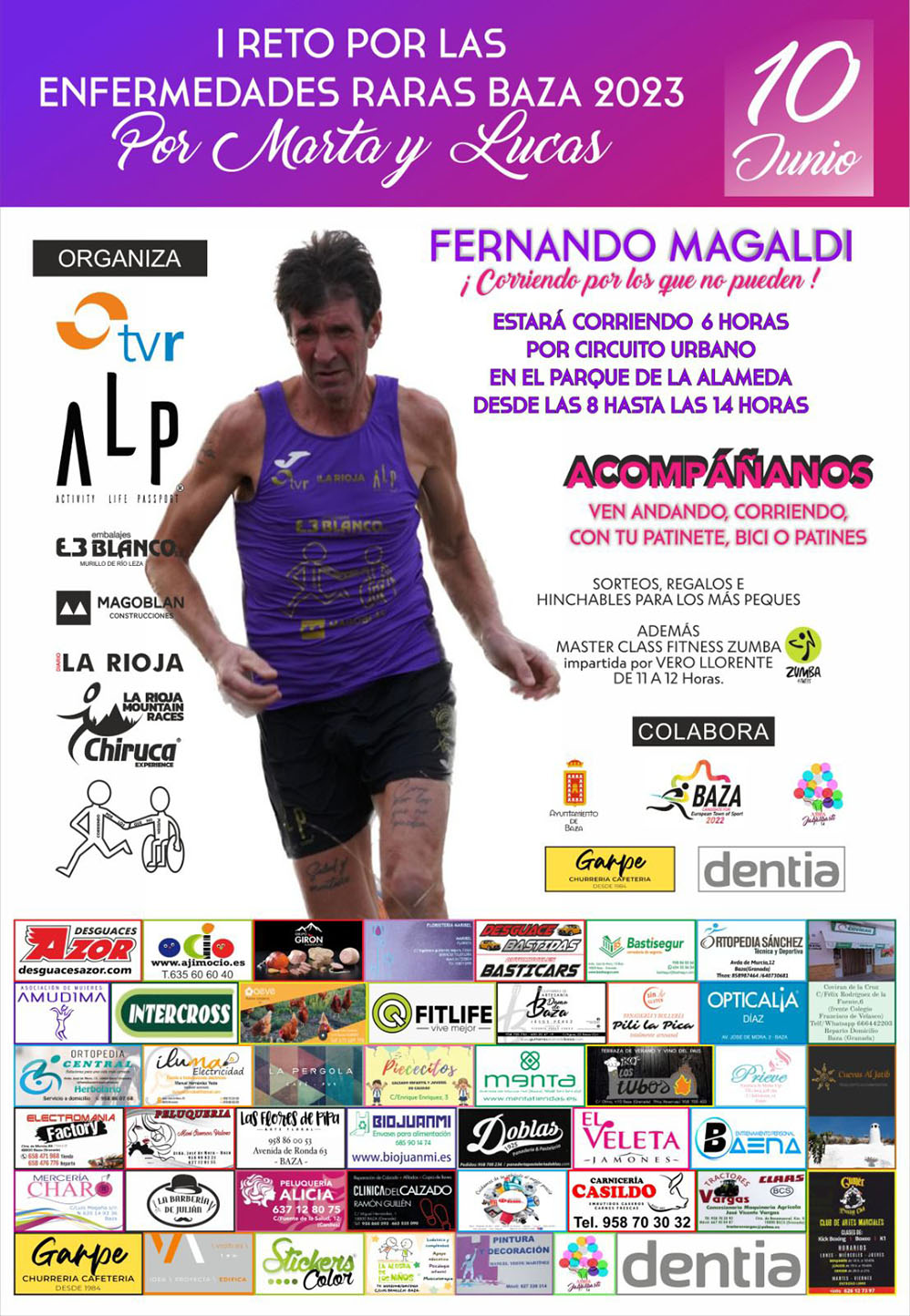 I Reto por las Enfermedades Raras “Corriendo por los que no pueden” dedicado a los pequeños bastetanos Marta y Lucas. El próximo sábado 10 de junio tendrá lugar en Baza el I Reto por las Enfermedades Raras “Corriendo por los que no pueden” dedicado a dos niños bastetanos: Marta y Lucas. Marta es una niña de 4 años que padece una mutación en el gen TBL1XR1 y Lucas es un niño de 6 años que padece el Síndrome de West. El reto está dentro del proyecto “Corriendo por los que no pueden”, llevado a cabo por el atleta riojano-cántabro Fernando Velasco Magaldi, que desde hace tiempo se ha especializado en promover actividades deportivas para visibilizar algunas enfermedades raras.