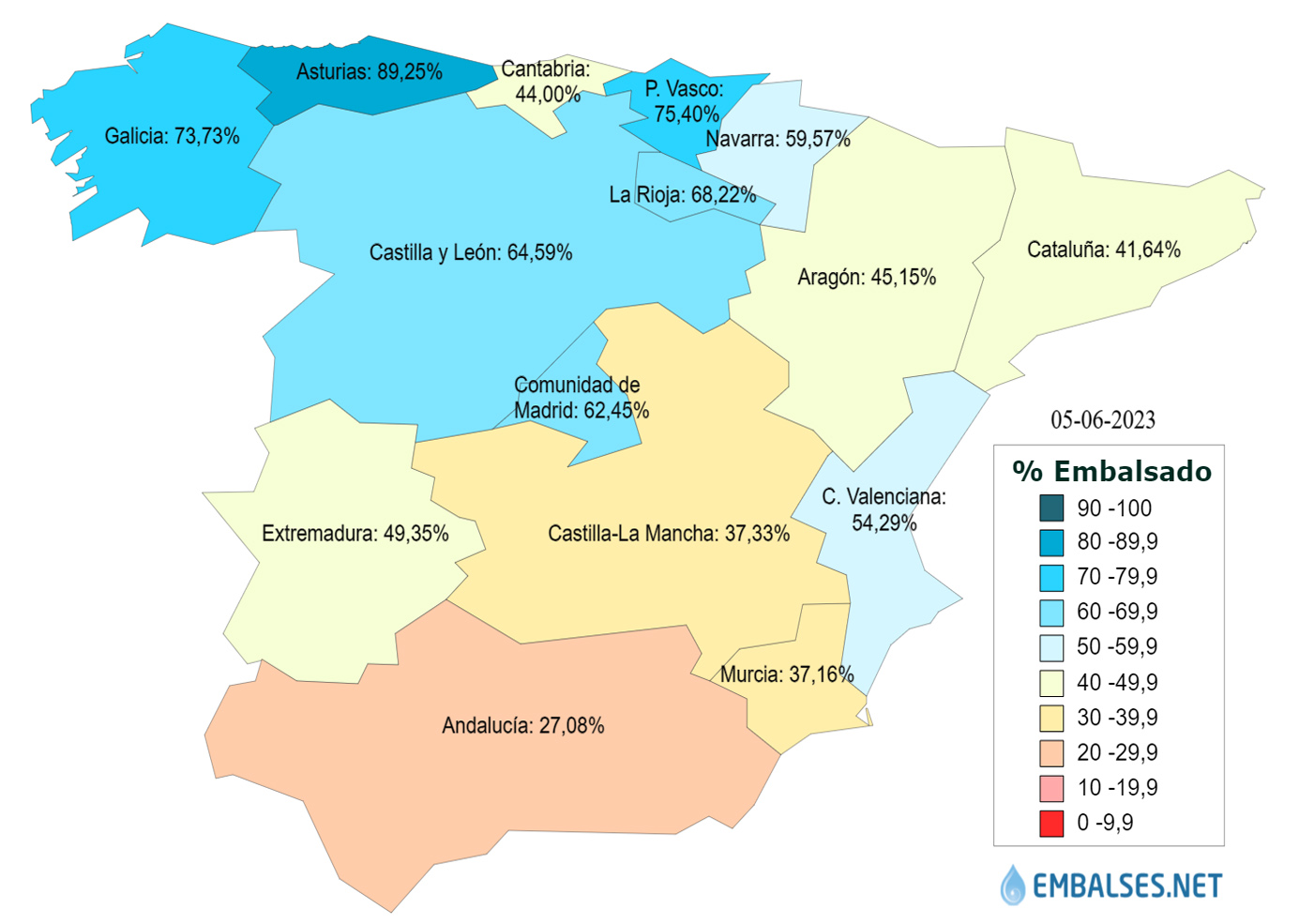 Las cuencas que se encuentran con un almacenamiento superior al 60% son: Cantábrico Occidental, que se encuentra al 89%, Cantábrico Oriental al 87,7%, Cuencas internas del País Vasco al 81%, Galicia Costa al 79,2%, Miño-Sil al 71,6%, Tinto, Odiel y Piedras al 69% y Duero al 64,4%,