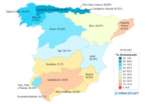 Entre el 60% y el 30%, las cuencas del Tajo al 58,8%, Júcar al 58,3%, Ebro al 48,7%, Segura al 36,1%, Cuenca Mediterránea Andaluza al 34,3% y Guadiana al 31,8%