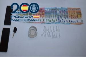 Durante la inspección, los policías localizaron un monedero de cuero con 16 gramos de cocaína distribuidos en 15 pequeñas dosis listas para su venta. También hallaron 460 euros en efectivo, repartidos en billetes de distinto valor, que presuntamente procedían de transacciones anteriores. Además, se incautaron dos teléfonos móviles y el coche utilizado.