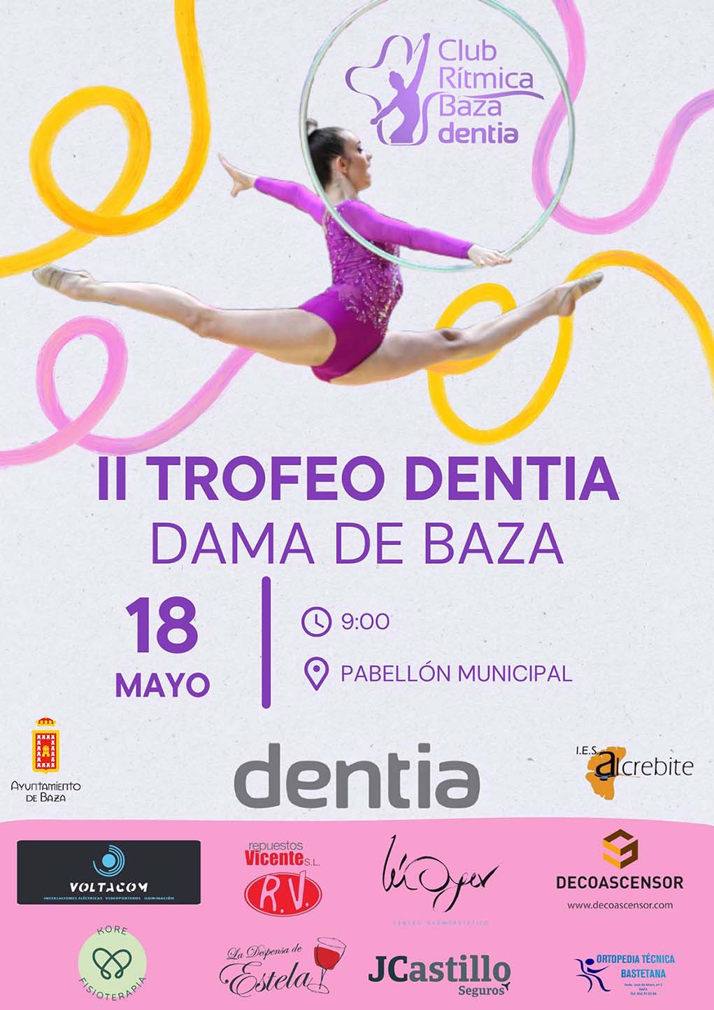 Baza acogerá a más de 500 gimnastas en el II Trofeo Dentia Dama de Baza de gimnasia rítmica. El Pabellón Municipal de Deportes de Baza será el escenario, el próximo domingo 18 de mayo, del II Trofeo Dentia Dama de Baza de gimnasia rítmica, una cita que se consolida en el calendario deportivo andaluz y que reunirá a más de 500 gimnastas procedentes de toda la comunidad autónoma.