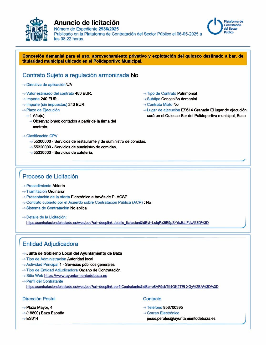 El anuncio ya se encuentra publicado en la Plataforma de Contratación del Sector Público, desde donde los interesados pueden consultar los detalles del procedimiento. La concesión contempla el uso, aprovechamiento privativo y explotación del quiosco, de titularidad municipal, con un canon mínimo mensual de 20 euros, susceptible de ser mejorado al alza por los licitadores.