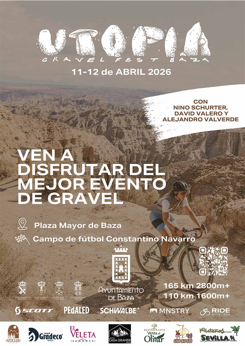 Baza reúne a la élite internacional del gravel en la cuarta edición de Utopía Gravel que se celebrará el próximo fin de semana. La ciudad de Baza acogeré, del 10 al 12 de abril, una nueva edición de la prueba ciclista Utopía Gravel, que alcanza su cuarta convocatoria consolidada como una de las citas más relevantes del calendario internacional de esta disciplina. El evento, que cuenta con la colaboración del Ayuntamiento, combinará competición deportiva y promoción turística en distintos puntos del municipio y su entorno.