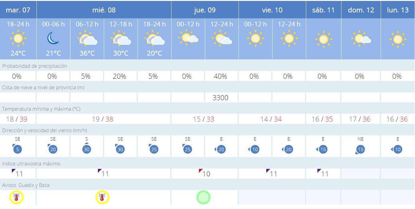 No afloja el calor y AEMET prolonga hoy su alerta amarilla por altas temperaturas en nuestra zona. La Agencia Estatal de Meteorología (Aemet) prevé activar para hoy, miércoles 8 7 de julio, un nuevo aviso de nivel amarillo en la zona del norte provincial, con temperaturas máximas de 38ºC en Baza, algo más suave que en otros lugares de nuestra Comunidad, en los que la alerta será de nivel naranja, por riesgo de temperaturas máximas de hasta 42 grados en las provincias andaluzas de Huelva, Cádiz, Sevilla, Córdoba y Jaén.