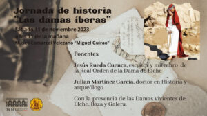 El Museo Comarcal de Vélez Rubio acogerá una jornada de Historia sobre las Damas íberas. El próximo sábado, 11 de noviembre de 2023, a las 11 de la mañana tres damas Íberas vivientes, la de Elche, Baza y Galera, se reunirán en el Museo Comarcal Velezano “Miguel Guirao” de Vélez Rubio, en una jornada de Historia en la que participaran dos cualificados ponentes: Jesús Rueda Cuenca, escritor y miembro de la Real Orden de la Dama de Elche, y Julián Martínez García, doctor en Historia y arqueólogo.