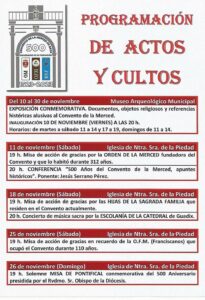 Del mismo modo, se llevarán a cabo una serie de actividades culturales. El día 10 de noviembre se inaugura una exposición, en el Museo Municipal, con documentos, objetos sagrados, etc., que son significativos y que han formado parte de la historia del convento de la Merced. Habrá también una conferencia: “500 años del Convento de la Merced: apuntes históricos”, ofrecida por Jesús Serrano, el día 11 de noviembre, a las 20:00 horas, en la iglesia de la Piedad y un concierto de música a cargo de la Escolanía de Niños Cantores de la Santa y Apostólica Iglesia Catedral de Guadix, el 18 de noviembre, a las 20:00 horas en la Piedad, siendo esta la primera vez que actuarán en nuestra ciudad.