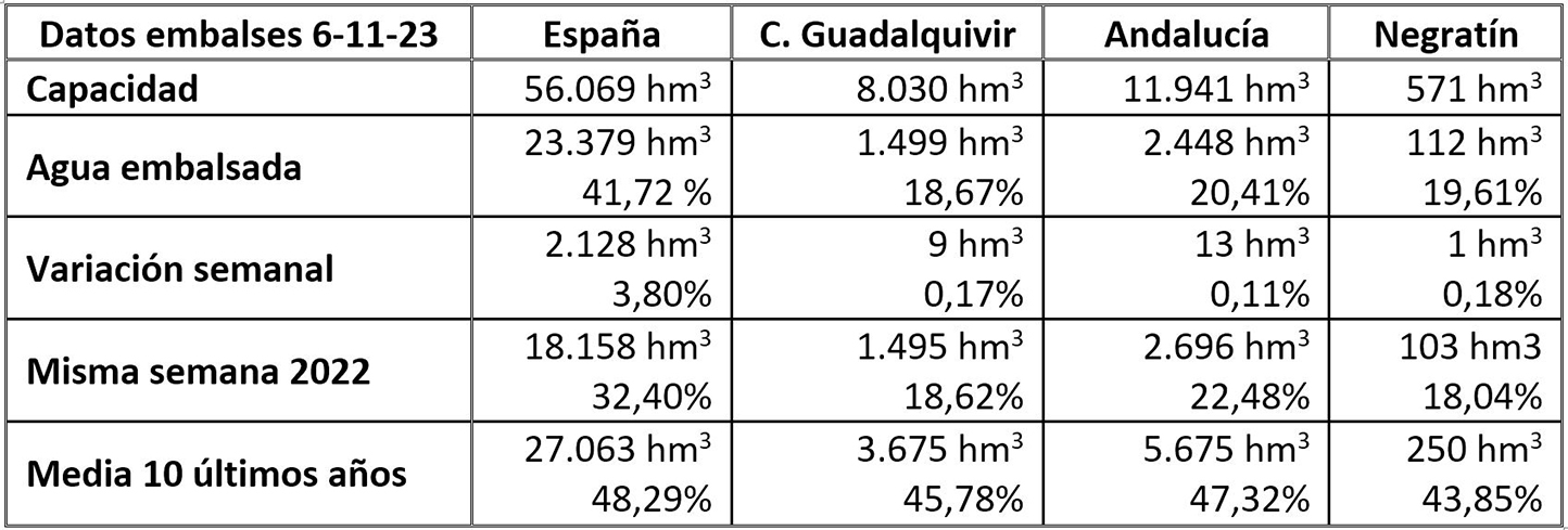 Fijarse en la zona de la España más seca nos lleva a cifras como las registradas en la Cuenca del Guadalquivir, donde el aumento de la semana que finalizaba el 6 de noviembre fue algo mejor que el de una semana antes, ascendiendo nada más que a 23 hm3, que suponen un 0,11% crecimiento del agua embalsada casi testimonial. Así las cosas, los datos recogidos de la Comunidad de Andalucía van en esa misma sintonía, como es lógico, con un crecimiento en su almacenamiento de 13 hm3, equivalentes a un porcentaje inferior al de hace siete días, coincidiendo con el mismo 0,11% que la cuenca que riega la mayor parte de esta Comunidad. Añadir que el Embalse del Negratín tuvo el mismo comportamiento que una semana antes, pues volvió a recoger nada más que 1 hm3, cuyo porcentaje supone un 0,18%.