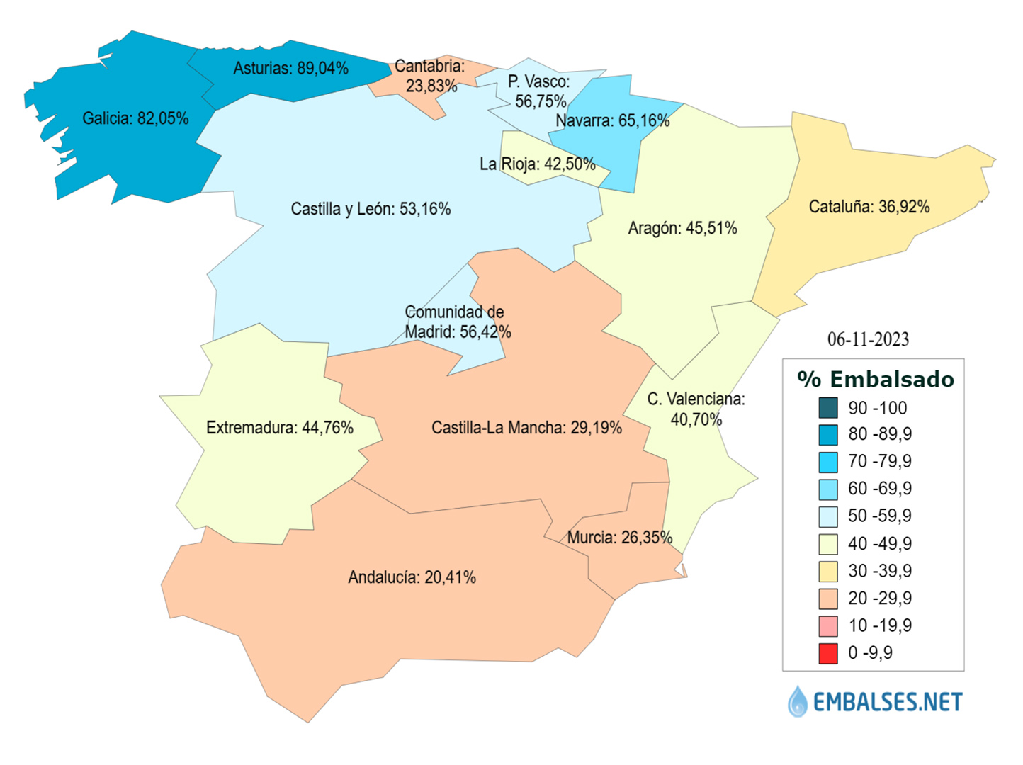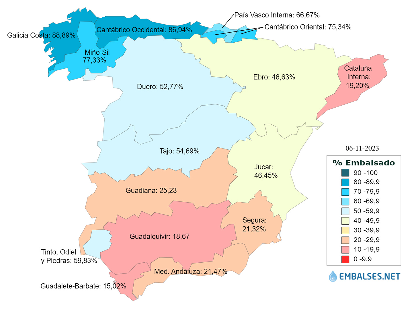 Entre el 60% y el 30% hay cinco cuencas más: Tinto, Odiel y Piedras al 59,8%, Tajo al 54,7%, Duero al 52,8%, Ebro al 46,6% y Júcar al 46,5%.