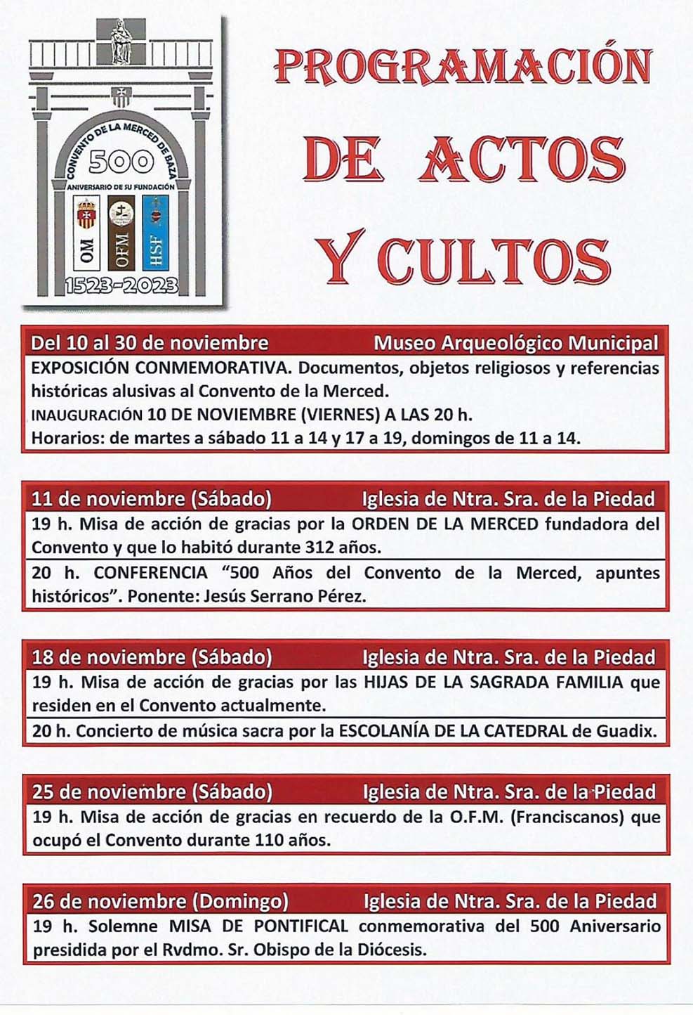 Una exposición en el Museo Municipal abre este viernes los actos del 500 aniversario de la fundación del convento e iglesia de la Merced que concluirán el 26 de noviembre. El domingo 26 de noviembre se cumplirán quinientos años de la fundación del convento e iglesia de la Merced. Aquel 26 de noviembre de 1523, cinco frailes mercedarios firmaban el documento en el que aceptaban la herencia que Luis de Acuña y Herrera les había dejado en su testamento un año antes. Se les entregaba dinero y un terreno en el arrabal de la Churra, en las afueras de la recién conquistada ciudad de Baza, para que construyeran sobre él una iglesia donde venerar a la virgen de la Piedad, encontrada allí mismo entre los restos de una antigua ermita mozárabe, y un convento donde pasarían a residir para vigilar a la imagen. Así nacían lo que hoy es el convento de la Merced y la iglesia de la Piedad. Las obras, que comenzaron aquel mismo año, se terminaron en el último tercio del siglo XVIII y por aquellas dependencias pasaron después los frailes de la Orden Franciscana y, en la actualidad, las monjas de vida contemplativa de las Hijas de la Sagrada Familia.
