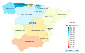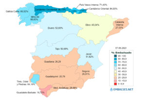 Las cuencas que se encuentran con un almacenamiento superior al 60% son: Cantábrico Occidental al 86,73%, Cantábrico Oriental se encuentra al 84,9%, Cuencas internas del País Vasco al 71,4% , Miño-Sil al 66,6%, Galicia Costa al 66,5% y Tinto, Odiel y Piedras al 64,2%.
