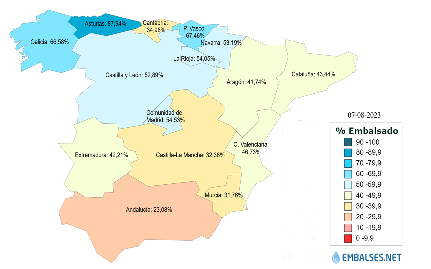La reserva hídrica española sigue disminuyendo y ya son seis las cuencas por debajo del 30%, con la del Guadalquivir al 20,8% y el Negratín al  21,37%. La reserva hídrica española está al 41,1 por ciento de su capacidad y el pasado lunes, 7 de agosto, era de 23.053 hectómetros cúbicos (hm³) de agua, lo que supone haber disminuido su cantidad de agua embalsada, en la última semana, en 584 hectómetros cúbicos (el 1,0 por ciento de la capacidad total actual de los embalses).
