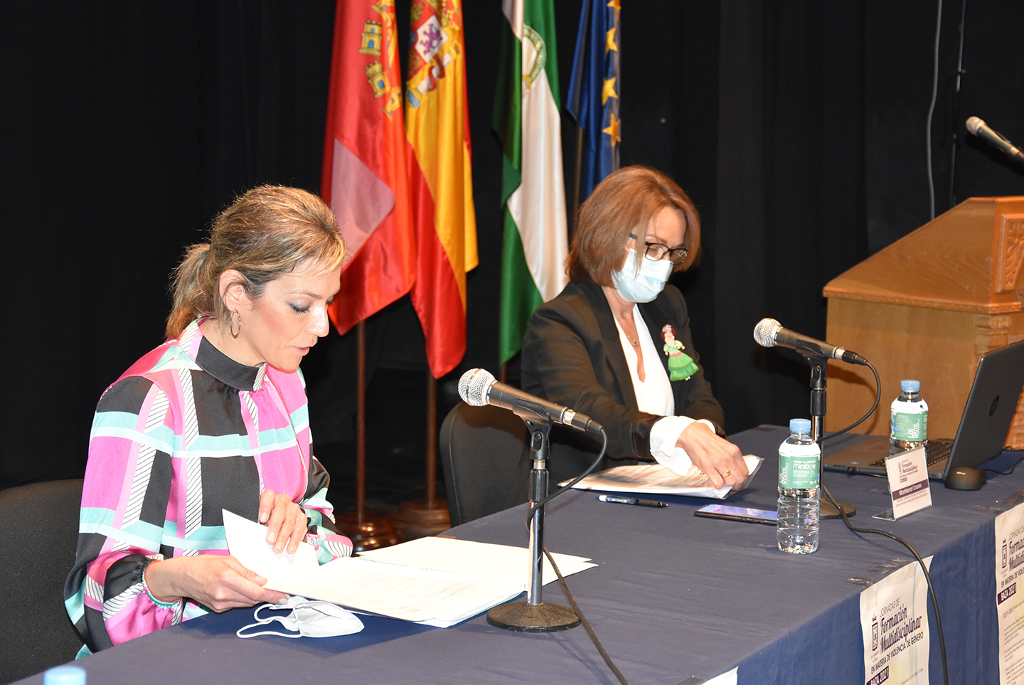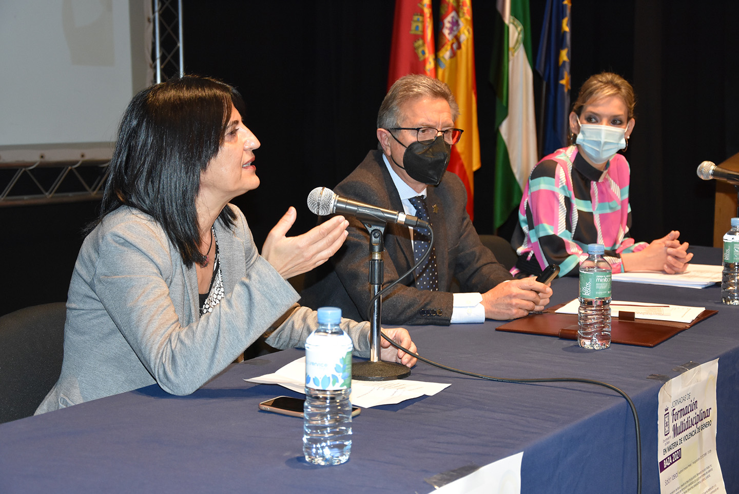 La primera ponencia estuvo dedicada a asistencia jurídica a las víctimas de violencia de género y corrió a cargo de Montserrat Linares, abogada y presidenta del Grupo de Violencia de Género del Ilustre Colegio de Abogados de Granada. Se celebró a continuación una mesa redonda en la que la Jefa de la Unidad contra la Violencia sobre las Mujeres, Montserrat Muñoz, y el Inspector Jefe de la Unidad de Atención a la Familia y Mujer (UFAM), Miguel Nestares, hablaron, respectivamente, sobre la coordinación en el seguimiento y protección de las mujeres y sobre intervención policial en la violencia hacia las mujeres, Sistema Viogén.