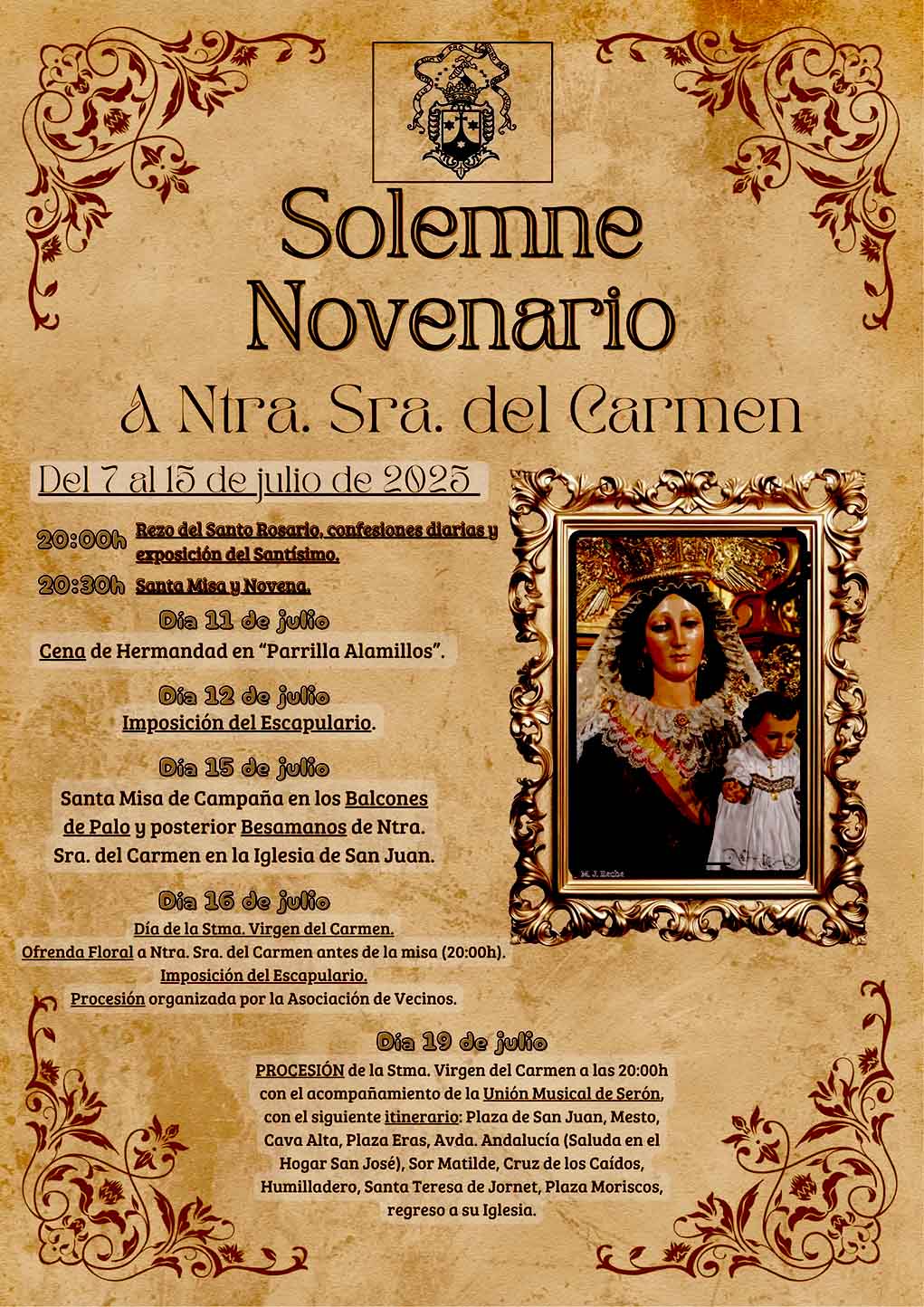 En marcha el Novenario y los tradicionales actos festivos del barrio de San Juan en honor a la Virgen del Carmen. El barrio de San Juan ya vive con intensidad el Novenario y los actos religiosos y festivos en honor a la Virgen del Carmen. Las celebraciones comenzaron el pasado lunes 7 de julio con el inicio de los actos religiosos, que incluyen el rezo del Santo Rosario, confesiones diarias y la exposición del Santísimo, cada día a las 20:00 horas. A las 20:30 se celebra la Santa Misa y la Novena.