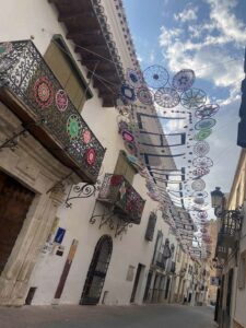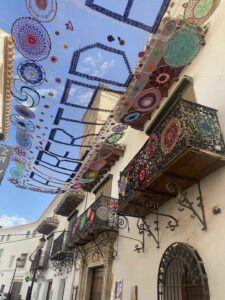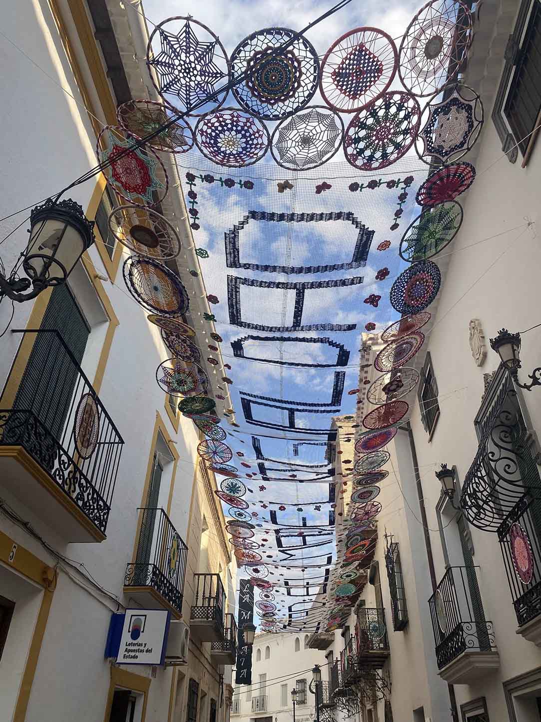 Eso sí, el camino no fue fácil. “He tenido mis momentos de agobio, sobre todo cuando se acercaba la fecha límite”, confiesa María Elena. A las prisas se sumaron los retos técnicos: la desigualdad en la altura de las casas y las dificultades para fijar el toldo en algunos puntos complicaron la instalación. A pesar de todo, no solo se logró cubrir gran parte de la calle, sino que incluso se amplió la decoración a balcones y otros elementos, como el emblemático Palacio de los Segura, y aún sobró material que la asociación piensa reutilizar en futuros proyectos.