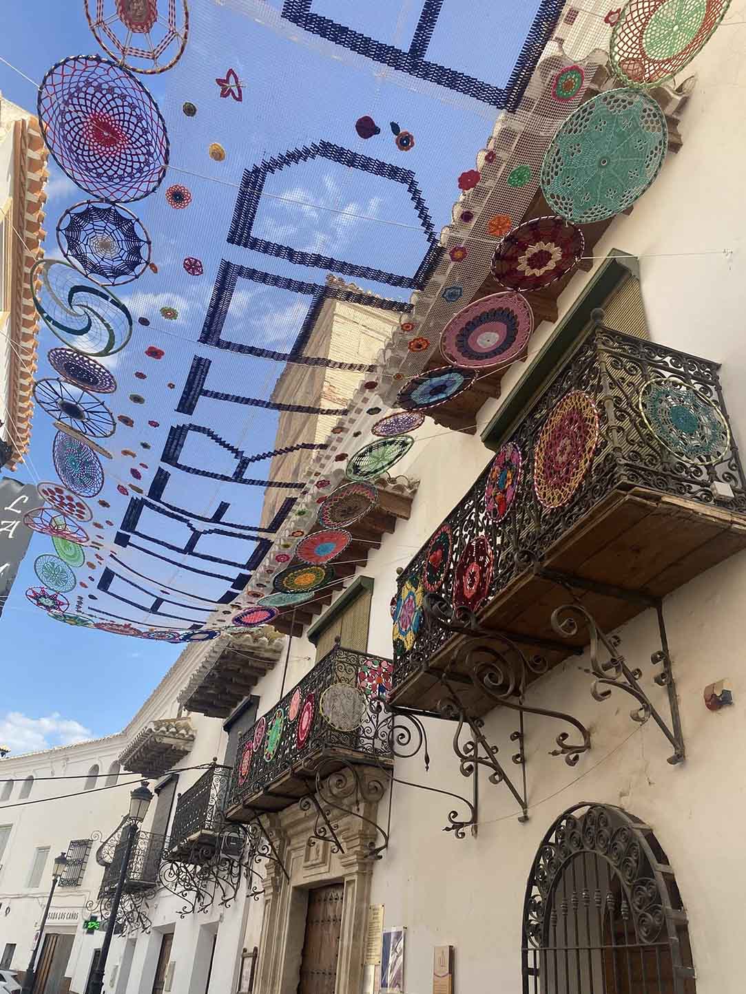 La obra, fruto de semanas de trabajo cooperativo y minucioso, ha sido realizada a mano por las socias de la asociación de mujeres “La Mimbrera”, bajo la dirección de su presidenta, María Elena Motos Rozas. El objetivo era doble: combatir los rigores del sol veraniego y embellecer una de las zonas más representativas de Orce. El resultado: una estructura de malla cuidadosamente tejida, adornada con cientos de piezas artesanales elaboradas con técnica de croché, muchas de ellas en forma de aros que cuelgan del entramado y que también decoran balcones y fachadas.