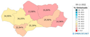 Por lo que se refiere a la Cuenca del Guadalquivir, a fecha de ayer, 8 de noviembre, había 1.495 hm3 de agua embalsada, equivalentes a un 18.62% de su capacidad de almacenamiento, que es de 8.030 hm3, lo que refleja un nuevo descenso del 0,07% respecto a la semana anterior, cuando se almacenaban 6 hm3 más. En cuanto a la media de la misma semana en los diez últimos años, la diferencia es mayor todavía, pues ofrece unas cifras de 4.004 hm3, que es un 49.87% de su capacidad total.
