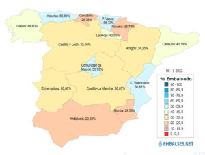 Uso embalses cuya situación por ámbitos, expresada en el tanto por ciento de agua embalsada en relación a su capacidad, es la que indicamos a continuación. Por encima del 50% están las cuencas del Tinto, Odiel y Piedras, al 63,8%; Cuencas internas del País Vasco, al 61,9%; Cantábrico Oriental, que se encuentra al 61,6%; Galicia Costa, al 56,7%; Cantábrico Occidental, al 56,1% y Júcar, al 52%. Entre el 50 y 30%, se encuentran la cuenca del Miño-Sil, al 44,6%; Tajo, al 37,3%; Cuenca Mediterránea Andaluza y Cuencas internas de Cataluña, ambas al 35,3%; Ebro, al 35%; Duero, al 33,1% y Segura, al 32,8%. Finalmente, las cuencas con menor porcentaje de agua embalsada, todas ellas por debajo del 30%, son las del Guadiana, al 23%; Guadalete-Barbate, al 21,5% y Guadalquivir, al 18,6%.